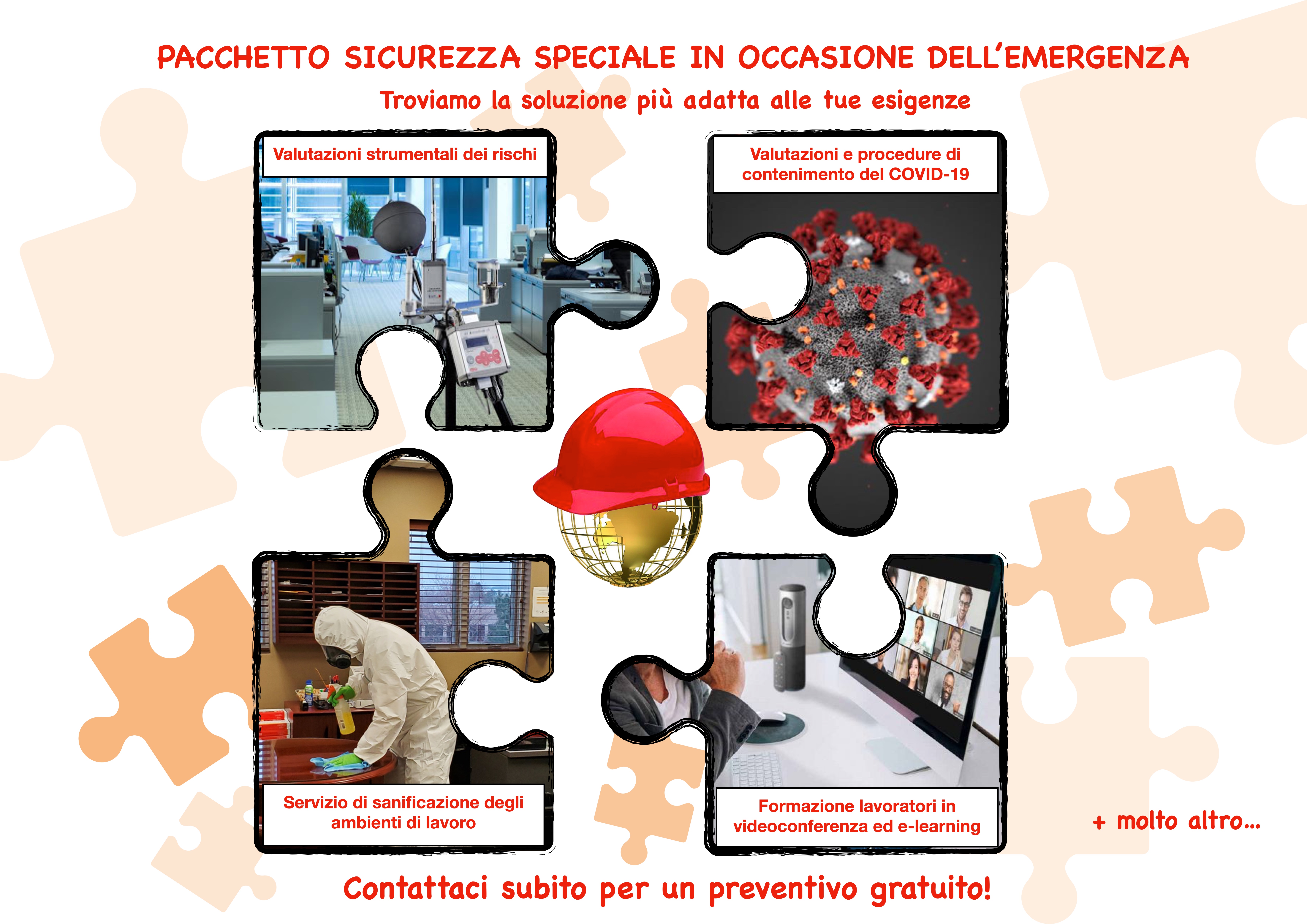 un pacchetto che integra l’igienizzazione dei luoghi di lavoro e tutte le misure anticontagio previste per ogni situazione, ai servizi di consulenza in materia di salute e sicurezza sul lavoro che da sempre garantiamo con professionalità.